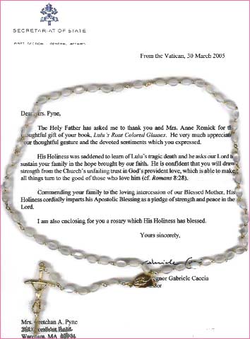 Vactican!! Pope John Paul received "Lulu's Rose Colored Glasses" on March 30, 2005. We hope that Lulu gave him strength in his last moments here on earth. The world will miss you... Heaven is rejoicing! |